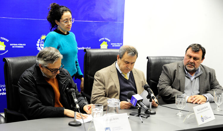 La firma del acuerdo se realizó en la sede del Ministerio de Vivienda y Ordenamiento Territorial (MVOT) y contó con la presencia del ministro Raúl Lozano, del subsecretario de la cartera, Tabaré Hackenbruch; el Director Nacional de Vivienda, Eduardo González, y el rector de la Udelar, Rodrigo Arim.