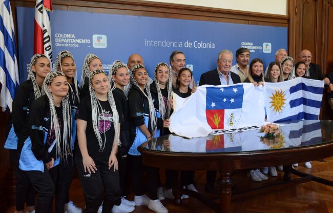 El Intendente Carlos Moreira Reisch hizo entrega de un Pabellón Nacional y una bandera con el escudo del departamento a la delegación coloniense de la Academia Gymdance, a cargo de la Profesora Estefanía Passerahut, que viaja el próximo 20 de noviembre al All Dance World 2023, que se realizará en la ciudad de Orlando, Estados Unidos.