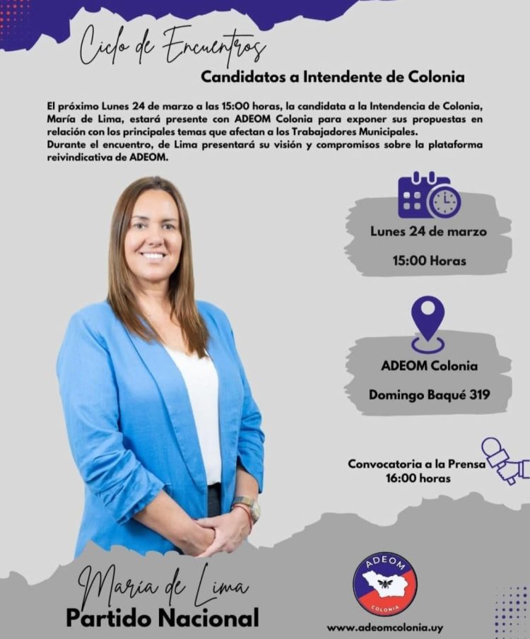 En el marco del Ciclo de Encuentros con los Candidatos a Intendentes de Colonia que organiza el gremio de municipales, este próximo lunes 24 de marzo será el turno para María de Lima.