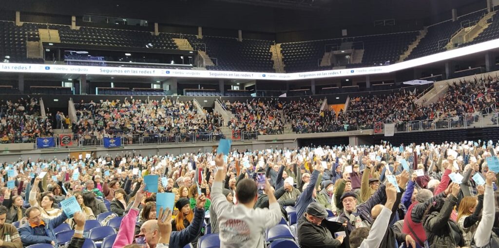 Un Antel Arena colmado de asambleístas fue el marco para una de las decisiones más importantes de AEBU en los últimos años. Todo el colectivo, activos y jubilados, aprobó en asamblea general la propuesta que presentó el Consejo Central en mayoría, 10 de los 11 consejeros, y de ese modo cerró una etapa de lucha, movilización y negociaciones en defensa de la Caja Bancaria.