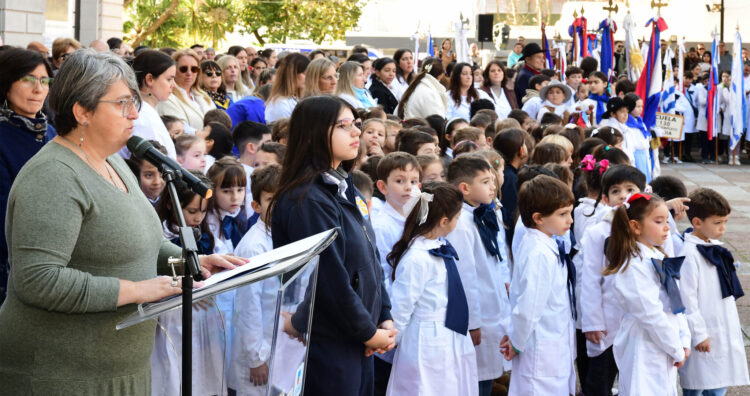 Cumpliendo con la tradición, se procedió a la toma de la promesa de fidelidad a la bandera por parte de la Inspectora Departamental de Educación Inicial y Primaria, la Maestra Sandra García, quien estuvo acompañada del abanderado del Pabellón Nacional de la Escuela Nº 1 José Gervasio Artigas, alumnos de dicha escuela y de los colegios San Juan Bautista, CENI y San Gabriel.