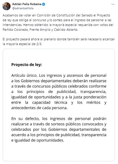La Comisión de Constitución y Legislación de la Cámara de Senadores, aprobó el proyecto de Ley impulsado por el legislador colorado Adrián Peña que busca reglamentar el ingreso de funcionarios a las intendencias.