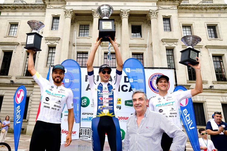 El brasileño Kacio Fonseca, del Swift Pro Cycling, y Martín Kijuto, de Progreso, completaron el podio (foto) de la etapa que llevaba el nombre de la Intendencia de Colonia y cuyo Secretario General, Guillermo Rodríguez, hizo entrega del trofeo al ganador.