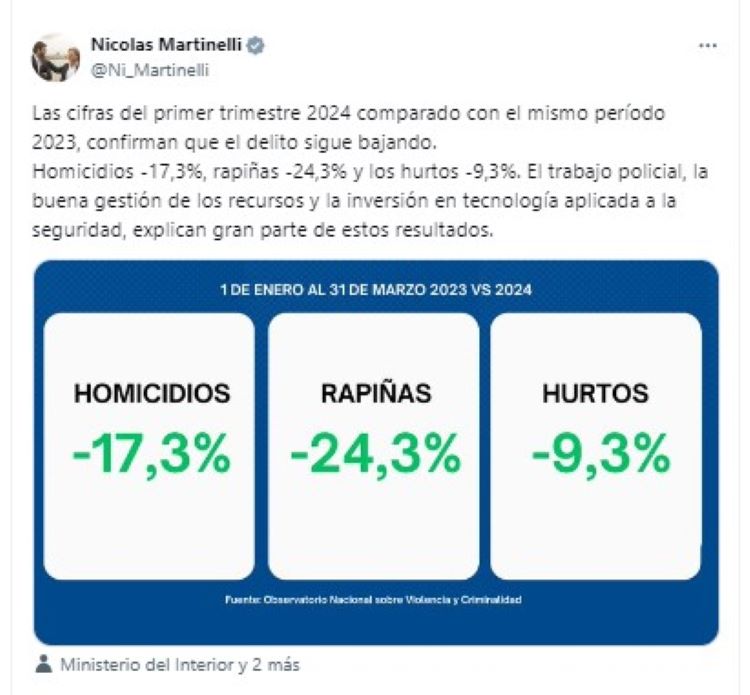 “El trabajo policial, la buena gestión de los recursos y la inversión en tecnología aplicada a la seguridad, explican gran parte de estos resultados”, sostuvo Martinelli en sus redes sociales.