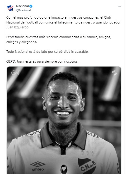 “Con el más profundo dolor e impacto en nuestros corazones, el Club Nacional de Football comunica el fallecimiento de nuestro querido jugador Juan Izquierdo. Expresamos nuestras más sinceras condolencias a su familia, amigos, colegas y allegados. Todo Nacional está de luto por su pérdida irreparable. QEPD. Juan, estarás para siempre con nosotros”, se expresó desde Nacional.