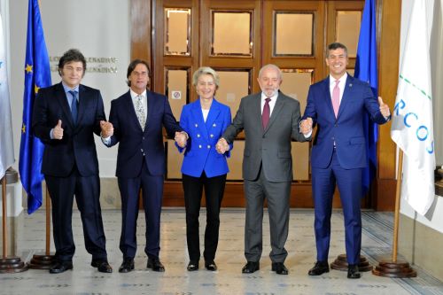 En conferencia de prensa que se realizó en el edificio sede del Mercosur, los presidentes Javier Milei, Luiz Inácio Da Silva, Santiago Peña y Luis Lacalle Pou, junto a la presidenta de la Comisión Europea, Ursula von der Leyen, anunciaron la concreción del acuerdo.
