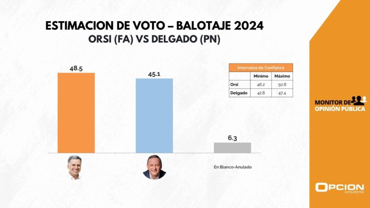 Por su parte, para Opción Consultores, que difundió este lunes su encuesta de intención de voto en Telenoche (Canal 4), Orsi recoge un 48,5%, Delgado el 45,1%, con un 6,3% en blanco o anulados.