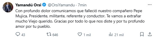 El actual mandatario escribió que “con profundo dolor comunicó que falleció nuestro compañero Pepe Mujica. Presidente, militante, referente y conductor. Te vamos a extrañar mucho Viejo querido”.
