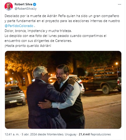 Una vez conocida la noticia anoche, varios dirigentes de todos los partidos políticos expresaron en la red social X su pesar recordando a Peña como un gran compañero, un buen tipo y un hombre de enorme compromiso.