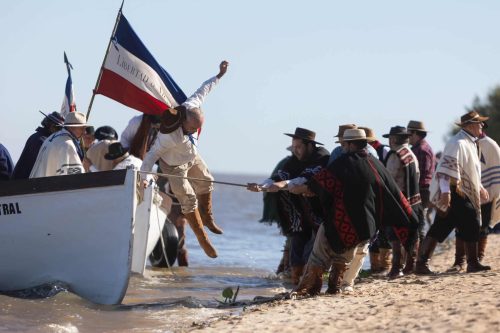 Acompañado por autoridades nacionales, departamentales y locales, el mandatario presenció la recreación del hecho histórico sucedido hace dos siglos en ese lugar del Río Uruguay.