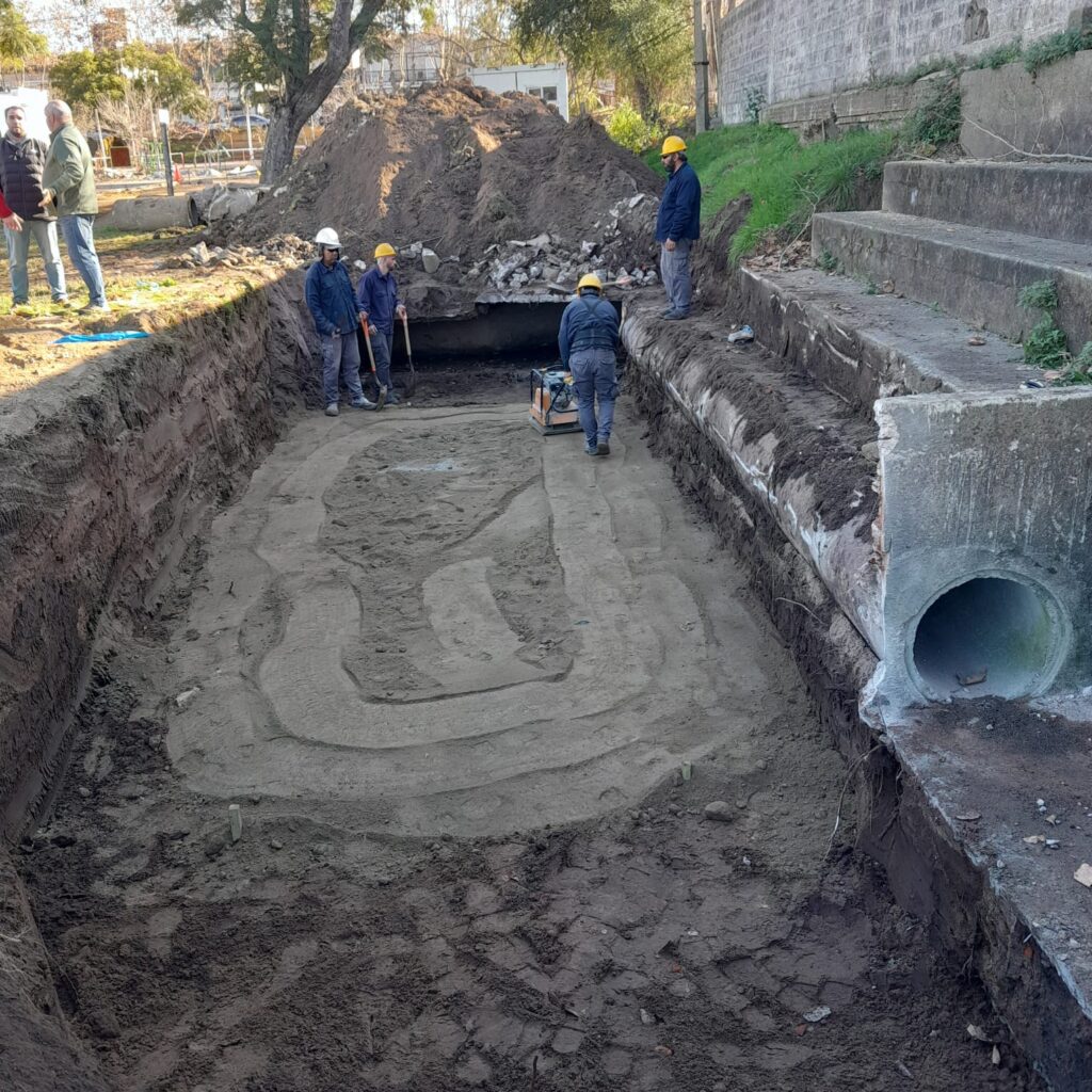 Nuestra visita coincidió con el día en que el Grupo IRT, por cuenta y orden de la Intendencia de Colonia, iniciaba unos muy importantes trabajos, con la sustitución de caños y construcción de nuevos y más amplios registros, en la red de desagüe pluvial que atraviesa, bajo tierra, la cancha del antiguo “field oficial”.