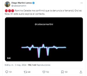Según una nueva declaración de la mediática al periodista Diego Martini, la denuncia radicada por la presunta víctima sería una falsedad y en un audio divulgado por él, la militante del Partido Nacional desacredita a la denunciante contra Orsi y carga contra Ignacio Álvarez, al parecer con la intención de adelantarse a los contenidos que se emitirían en su programa de Canal 4 de Montevideo.