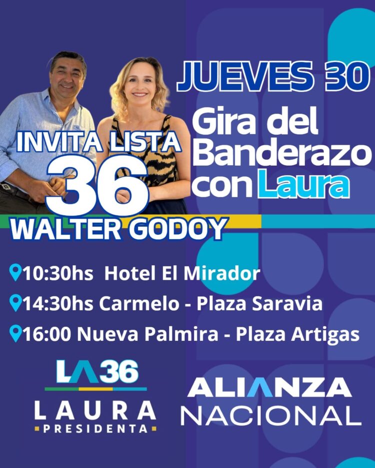 Este jueves 30 de mayo, en ocasión de la visita de Raffo al departamento, la Lista 36 invita y convoca a un banderazo a las 10.30 horas, en el Hotel El Mirador de Colonia del sacramento para recibir a la precandidata y luego acompañarla en su recorrida por las ciudades de Carmelo y Nueva Palmira, con actos partidarios en las plazas Saravia y Artigas respectivamente.