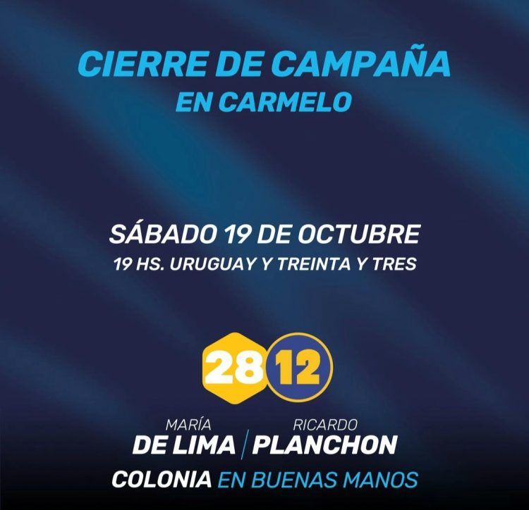 La lista 2812 del Partido Nacional, que postula a María de Lima y Ricardo Planchón como candidatos a la Cámara de Diputados, realiza este sábado 19 su acto de cierre en la ciudad de Carmelo.