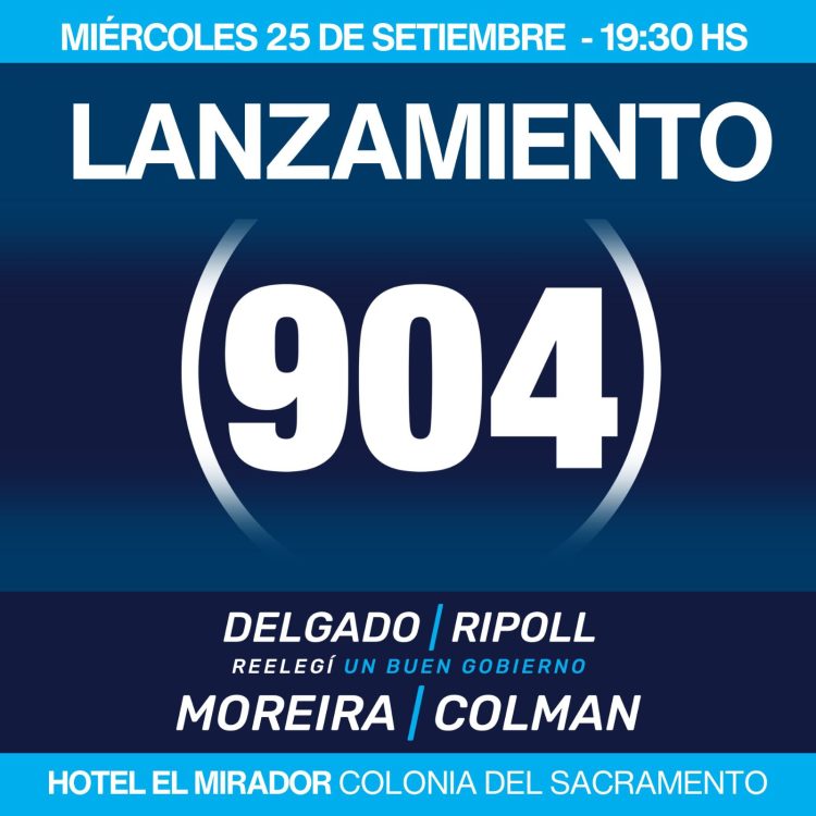 El próximo miércoles 25 de setiembre, a las 19.30 horas, en el Hotel El Mirador de la ciudad de Colonia, la lista 904 del Partido Nacional realizará el lanzamiento de su campaña de cara a a las elecciones nacionales de octubre.
