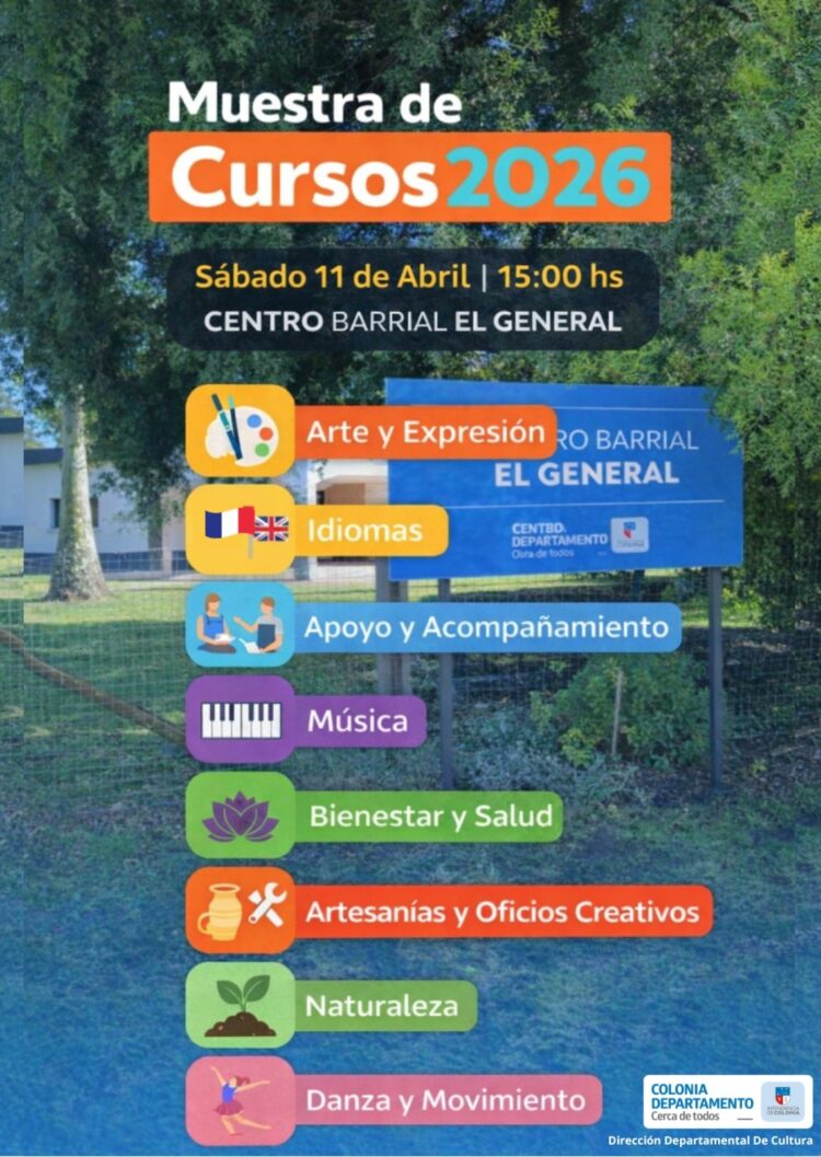 Este sábado 11 de abril, a las 15:00 horas, en el Centro Barrial El General se realizará la Muestra de Cursos 2026, una actividad organizada por la Intendencia de Colonia a través de su Dirección de Cultura y del propio centro.
