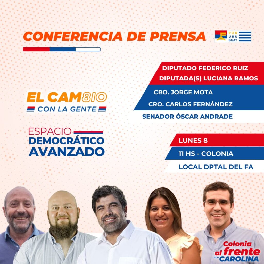 El lunes 8, en la sede de la Departamental del Frente Amplio, y con la presencia del senador Oscar Andrade, se realizará la presentación de la Lista 810, el lanzamiento de la candidatura de la Lista 1001 y la presentación del Espacio Democrático Avanzado.