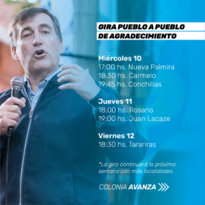 El líder del Movimiento Colonia Avanza del Partido Nacional, Ricardo Planchón, realizará una gira que tiene por objeto hacerse presente en todas las localidades y zonas rurales del departamento para “agradecer personalmente a toda la militancia y a los 2.874 vecinos que confiaron en nuestro proyecto político”, aseguró.