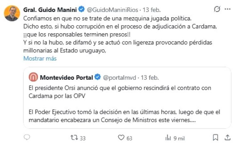 A través de un posteo en su cuenta oficial de X, Manini Ríos reclamó que si efectivamente “hubo corrupción en el proceso de adjudicación a Cardama”, entonces, “que los responsables terminen presos”.