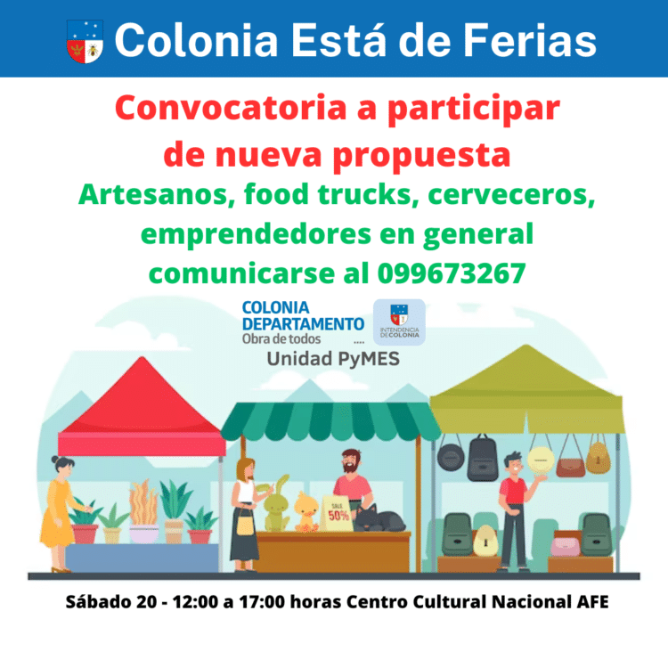 La Unidad Pymes de la Intendencia de Colonia, en el marco de su programa “Colonia está de Ferias”, convoca a emprendedores formales para integrarse a una nueva feria local que se pretende desarrollar en la capital departamental.